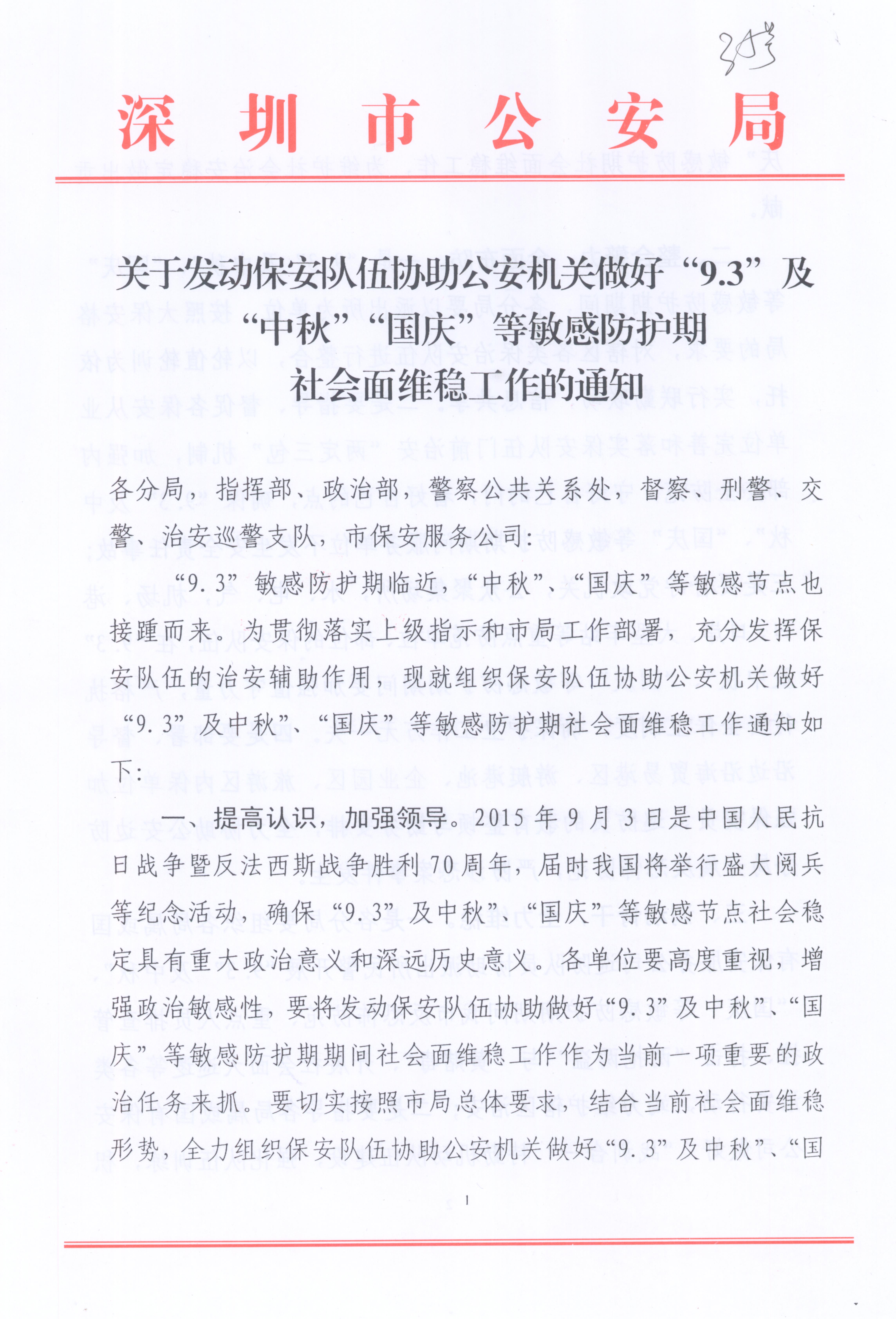 深圳市公安局关于做好‘9.3‘ ,‘中秋’,‘国庆’等维稳工作的通知