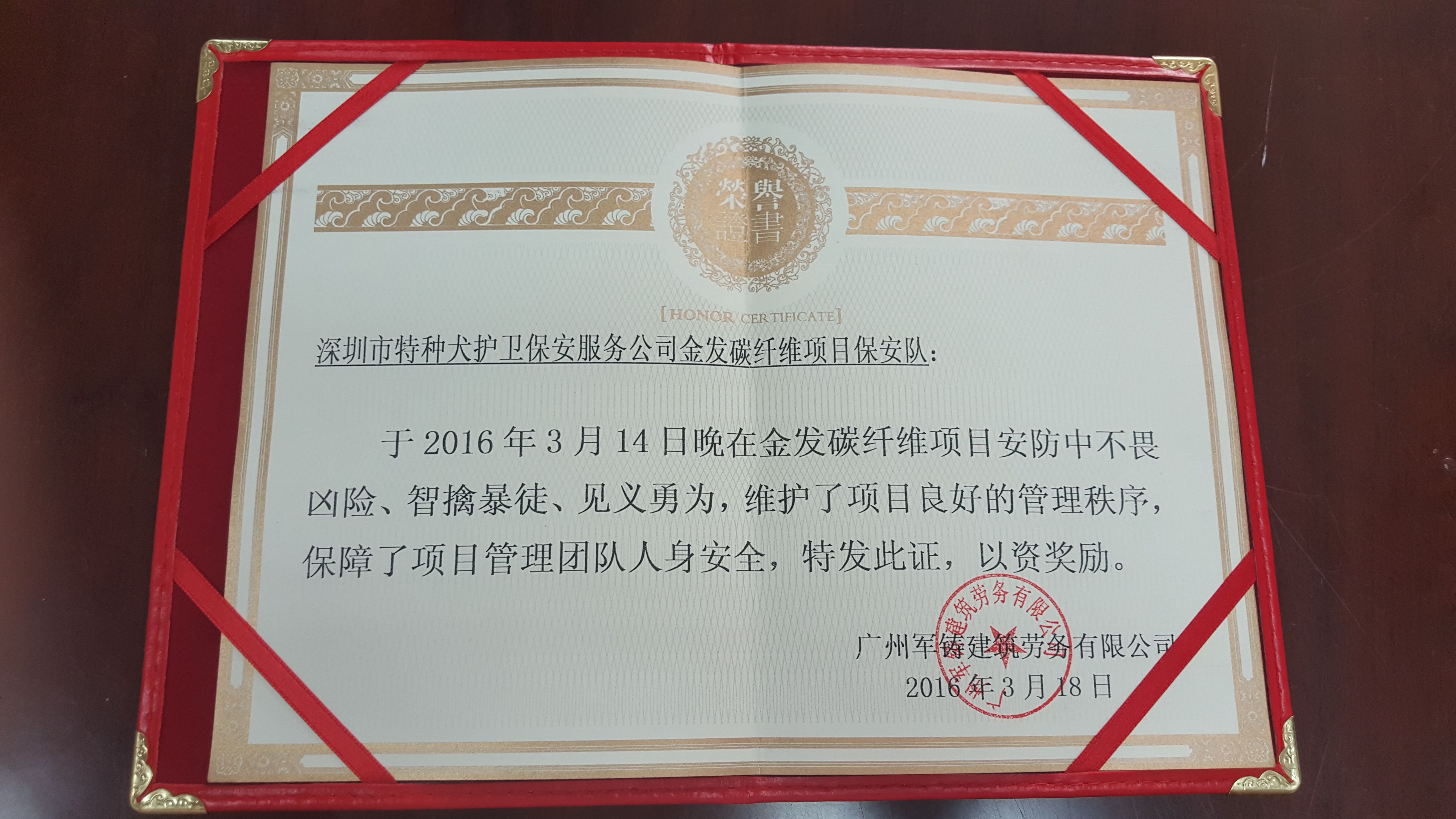 2016年3月14日下午,广州军铸工地护卫点,发生歹徒持刀威胁甲方老总事件。当时现场形势十分紧张,围观人群束手无策,事态严峻。在这紧要关头队长钱明文带领全体保安员迅猛出击,果断出手制服歹徒,夺下刀具,控制了帮凶同伙,将歹徒打了个措手不及。随后报警二名歹徒移交给赶来的派出所民警。
