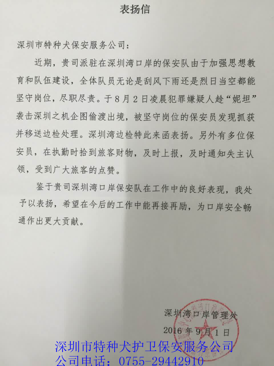 我司护卫七部受到深圳湾口岸管理处感谢信