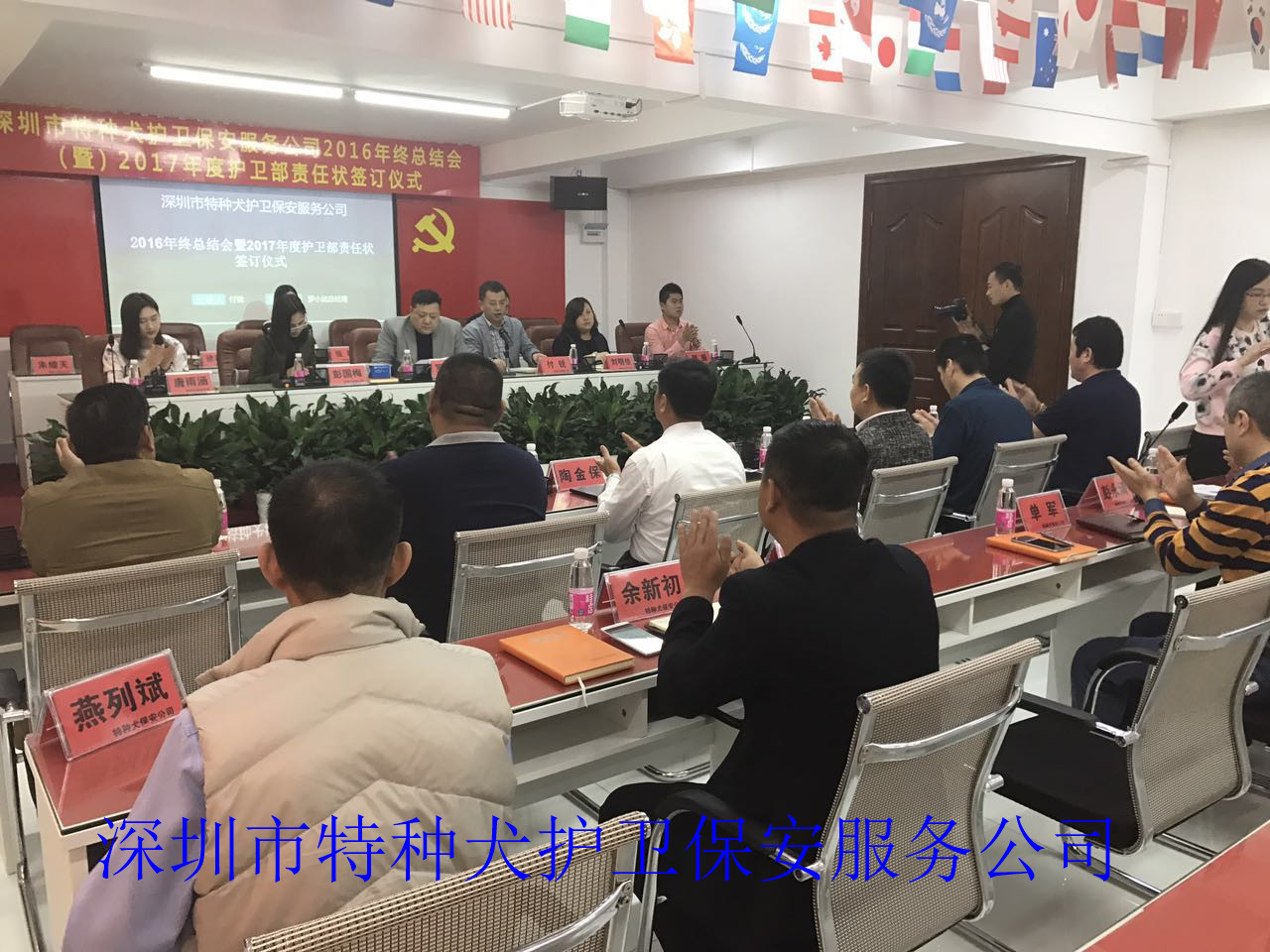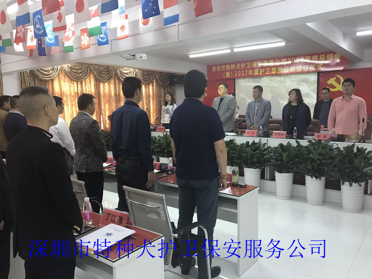 我司召开2016年度工作总结会议及2017年度护卫部责任状签订仪式 全体起立,奏国歌。 总经理发表年度工作总结