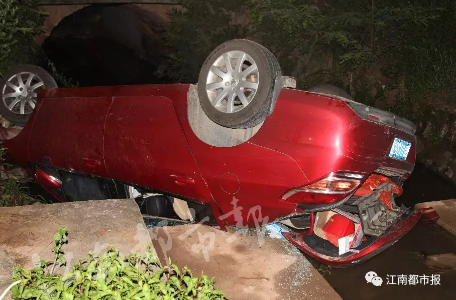 经专案组民警仔细勘察现场,多方查看监控视频及询问目击者,很快将肇事车辆锁定为赣BU13**红色标致小轿车。而当追缉组民警沿滨江东大道一路追逃至鼎龙高速公路入口附近时,却发现这辆红色标致小车已经冲出了路基,“四脚朝天”仰翻在公路外的草丛里,车上司机已不知所踪。