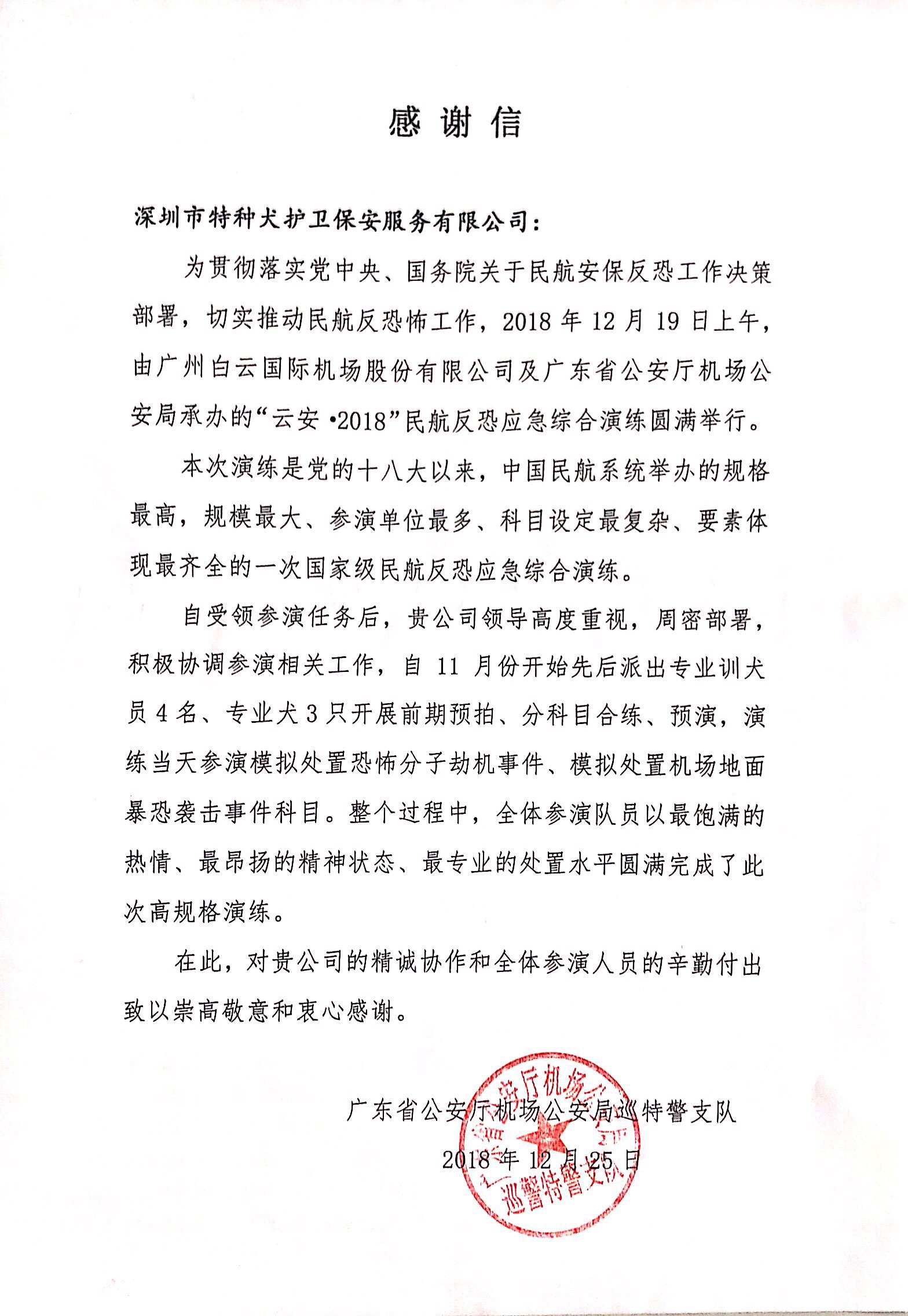 来自省公安厅机场公安局巡特警支队的感谢信