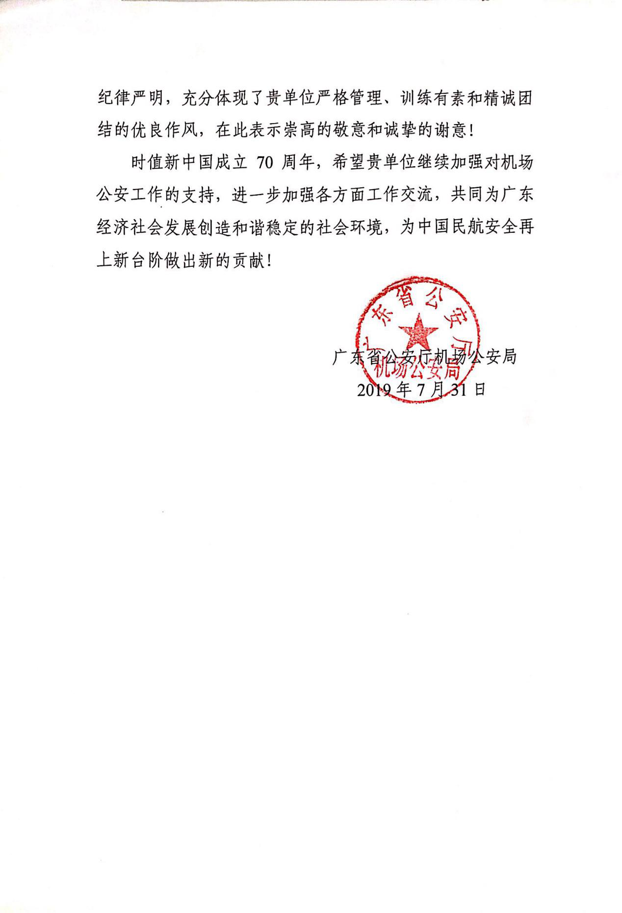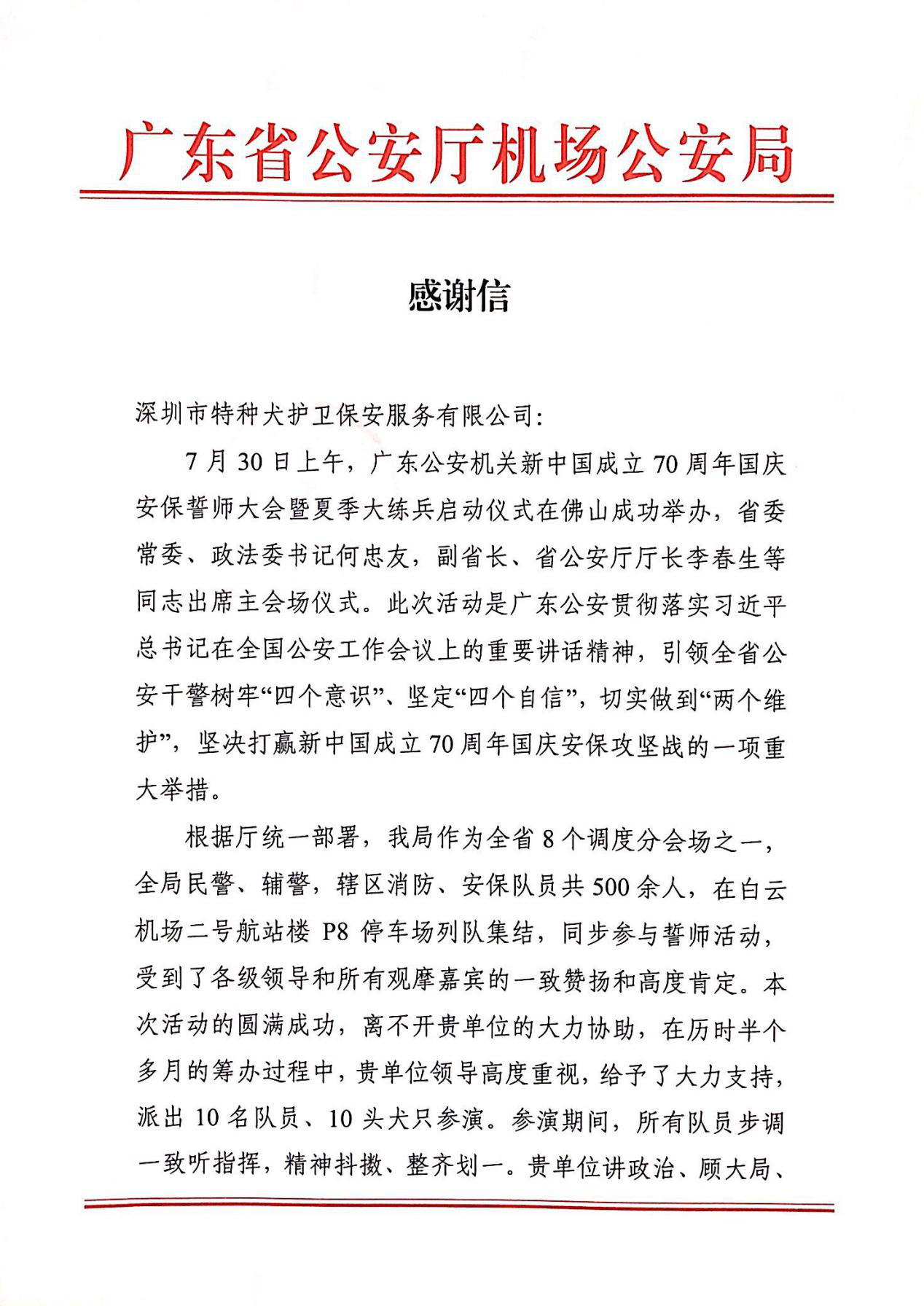 誓师大会结束后,机场公安局领导对我司犬防队员的表现给予了高度评价和赞扬,专程寄来感谢信,以肯定我司在此次誓师大会上的表现。