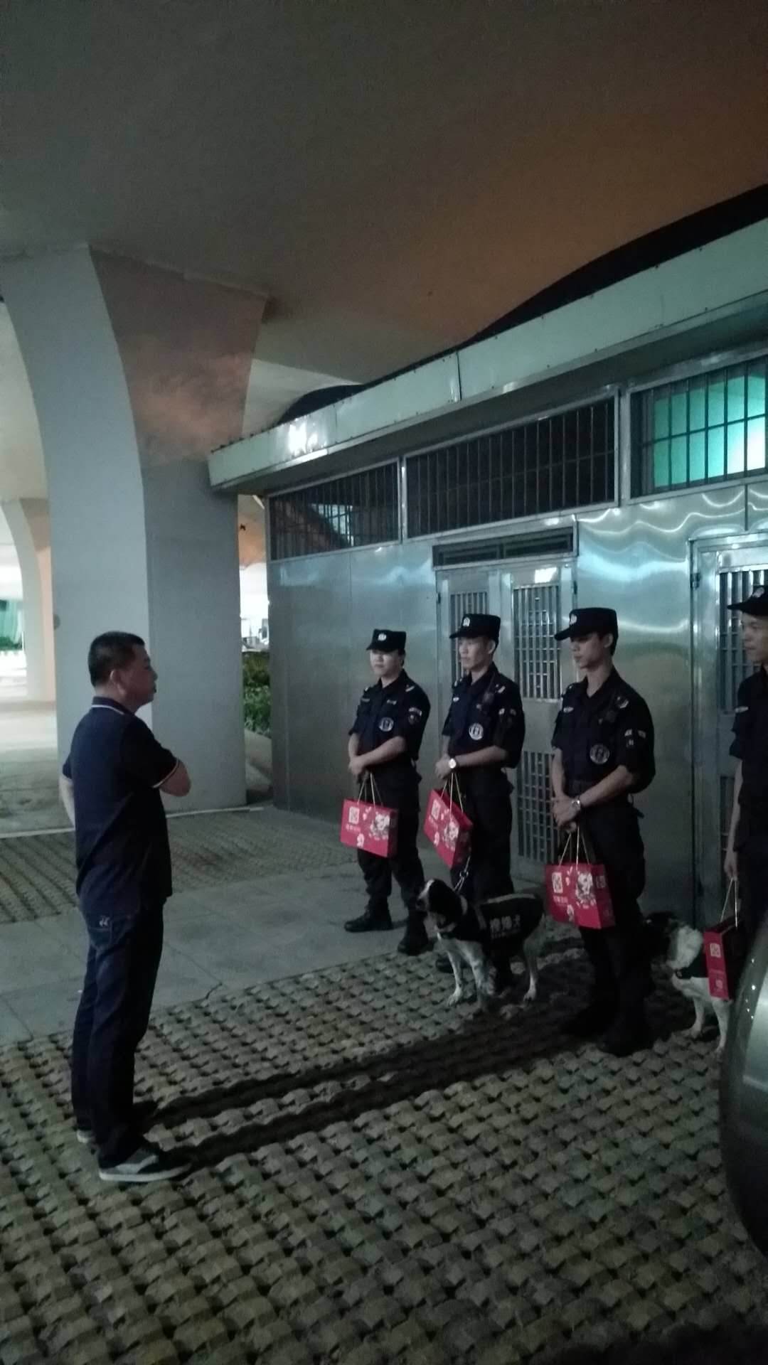 中秋佳节来临之际,公司付锐副总经理亲自到犬防白云机场执勤点慰问看望一线执勤队员,为队员带来节日问候和中秋月饼,在机场屯兵点傅总向队员了解当前勤务情况,中秋国庆即将到来,白云机场客流量增大,对安保工作增加了难度。傅总勉励大家要继续发扬公司的优良传统,岗位上认真负责,确保节日期间白云机场安保工作一切正常。