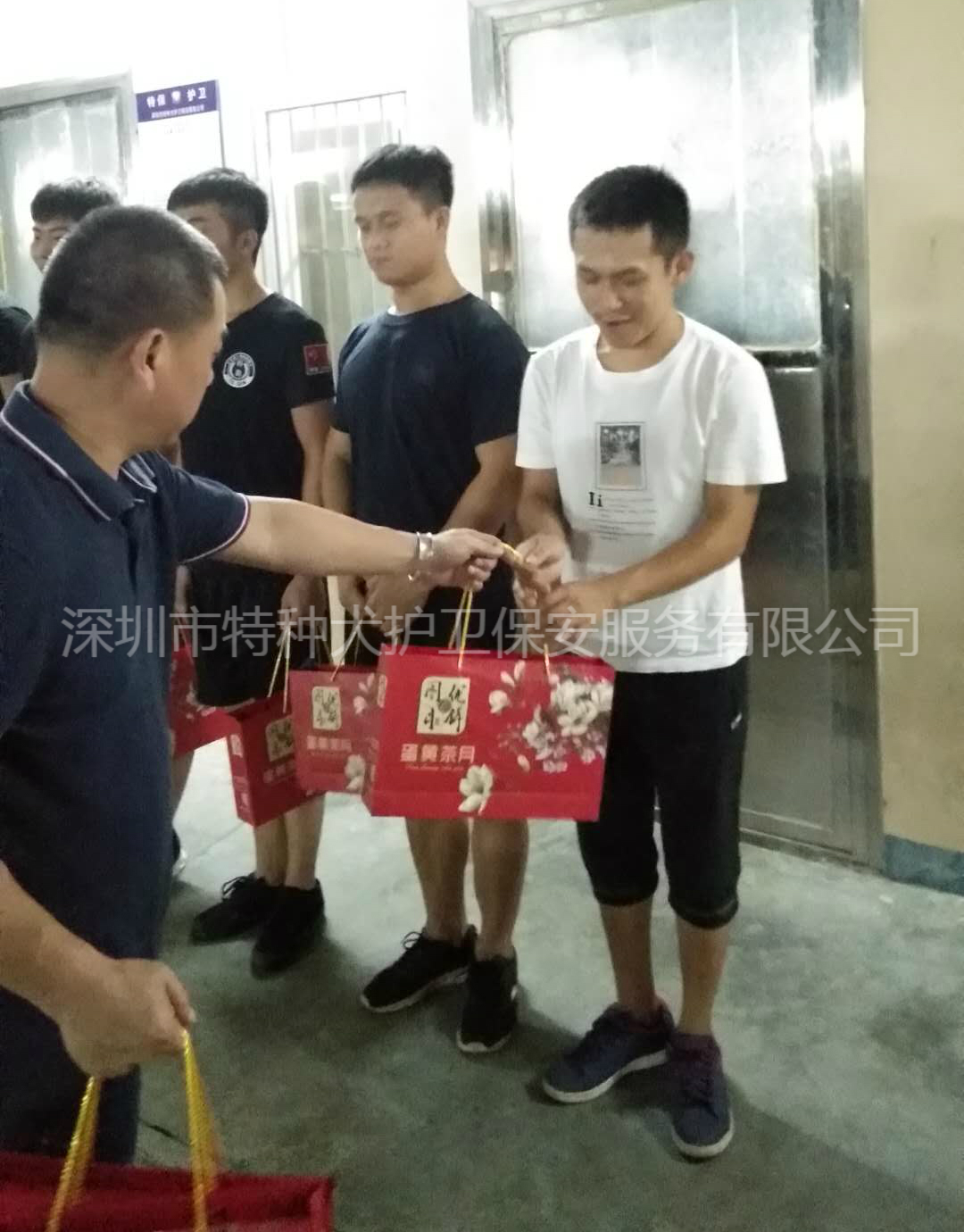 中秋佳节来临之际,公司付锐副总经理亲自到犬防白云机场执勤点慰问看望一线执勤队员,为队员带来节日问候和中秋月饼,在机场屯兵点傅总向队员了解当前勤务情况,中秋国庆即将到来,白云机场客流量增大,对安保工作增加了难度。付总勉励大家要继续发扬公司的优良传统,岗位上认真负责,确保节日期间白云机场安保工作一切正常。
