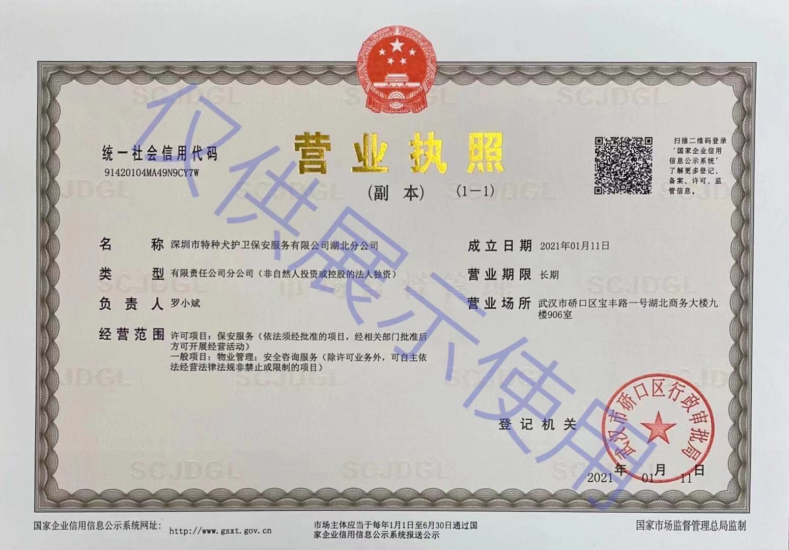 2021开年第一喜讯,深圳市特种犬护卫保安服务有限公司湖北分公司成立。